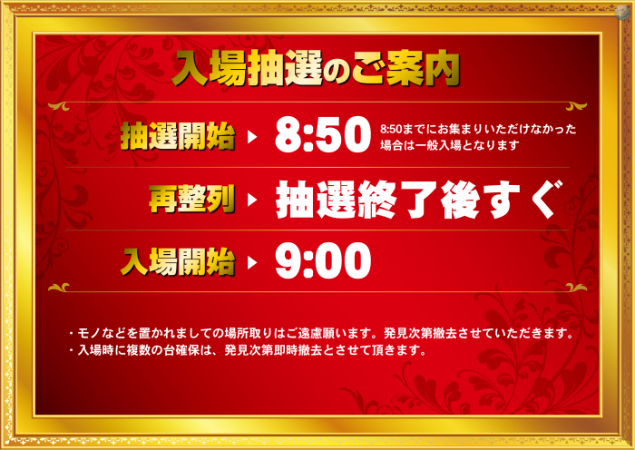 ÃêÁª³«»Ï 8:50¡¢ºÆÀ°Îó ÃêÁª½ªÎ»¸å¤¹¤°¡¢Æþ¾ì³«»Ï 9:00 |