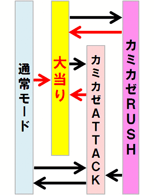 カミカゼRUSH終了後はカミカゼATTACKに突入し、ここで大当りを引いた場合も再度カミカゼRUSHへ突入する。
