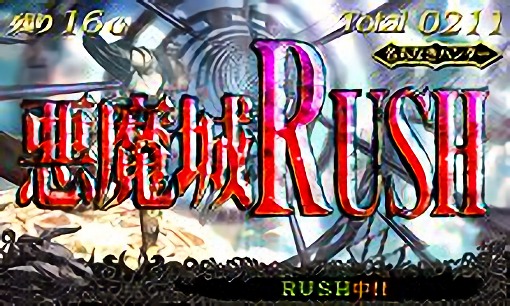 悪魔城ラッシュは、ART中に突入する基本10ゲームの上乗せ専用状態で、この間は全小役成立時にゲーム数の上乗せ抽選が行われる。ここでゲーム性のポイントとなるのが、悪魔城ラッシュの継続システムだ。滞在中は特殊リプレイ(黒BAR揃い)が成立する度に継続ゲーム数がリセットされるため、10ゲーム以内で特殊リプレイを引き続けることによりラッシュを継続させることができる。これにより引き次第でどこまでも続くかのような、期待感高まるゲーム性を実現しているのだ。