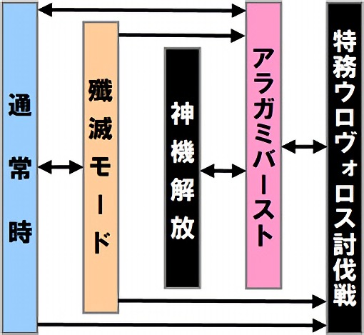 AT中は、バトル勝利でATゲーム数を上乗せする他、ATゲーム数上乗せゾーン「神機解放」を搭載。