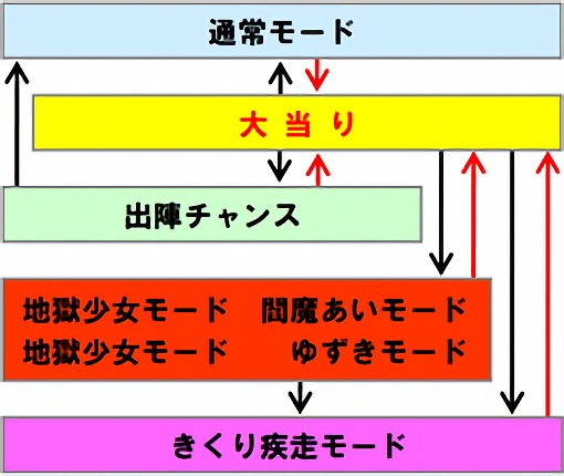 出玉のカギとなる次回大当りまで電サポ継続の確変「地獄少女モード 閻魔あいモード」or「地獄少女モード ゆずきモード」は「超大当り」後、「大当り」中に昇格した場合、「ミッションボーナス」中に怨みを晴らすことができた場合に突入。