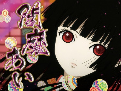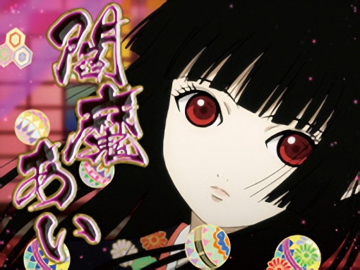 背景に地獄少女の主要キャラクターたちが映る。