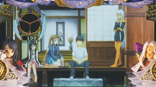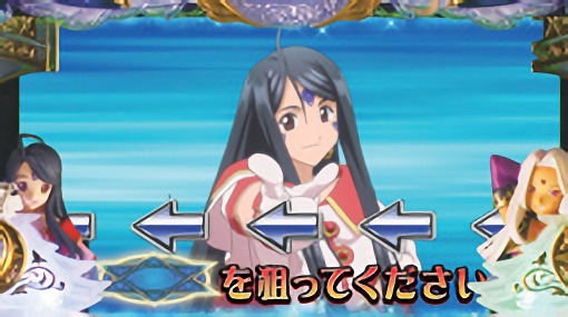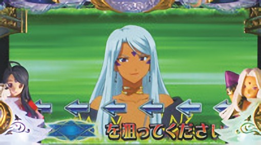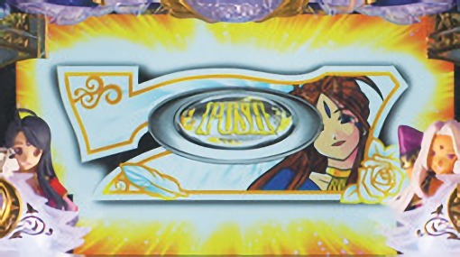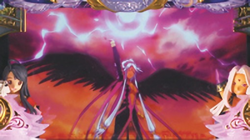 液晶全体を覆う巨大役物「ノルン役物」や、液晶両サイドから閉まる「魔方陣シャッター」など、世界観を再現した専用筐体「女神の誘」を採用。