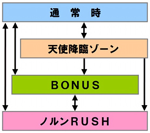 通常時は、ノルンRUSH自力高確ゾーン「天使降臨ゾーン」突入でART「ノルンRUSH」のチャンス。
